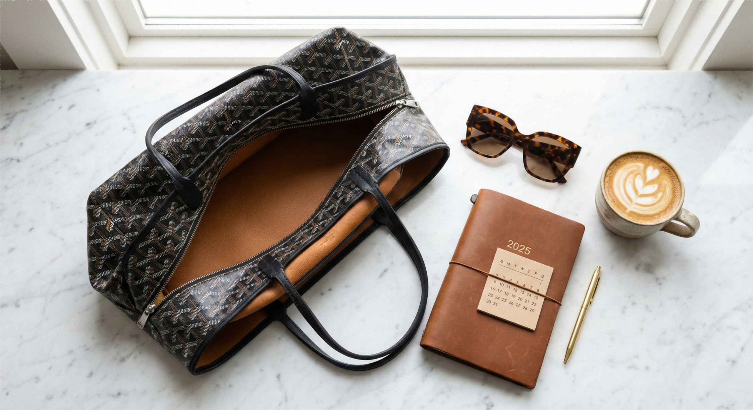 Lifestyle flat lay of a goyard replica bag 2025 edition with planner and coffee to illustrate luxury trends.